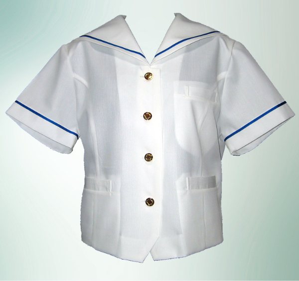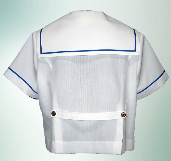 オフホワイトのボディに衿と袖に鮮やかなブルーラインが施された爽やかなイメージのセーラーで、 大きめなゴールドのボタンが品格をかもし出しています。