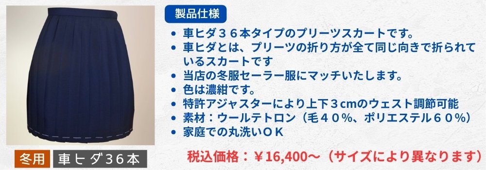 冬用濃紺プリーツスカート/車ヒダ36本 商品番号:STF1K-36 冬用濃紺プリーツスカート/車ヒダ36本 ウェストサイズ 58cm 60cm 63cm +1,000円 66cm +1,000円 69cm +1,000円 72cm +2,000円 75cm +2,000円 78cm +2,000円 82cm +3,000円 85cm +3,000円 88cm +3,000円 91cm +3,400円 95cm +3,400円 100cm+4,500円 105cm+4,500円 スカート丈 選択してください 35cm 40cm 45cm 50cm 55cm 在庫状態:在庫有り ¥16,400 只今お取扱い出来ません 数量 関連商品 冬濃紺セーラー服/濃紺白3本ライン襟/横チャック¥16,400冬濃紺セーラー服/白襟無地/横チャック¥16,400